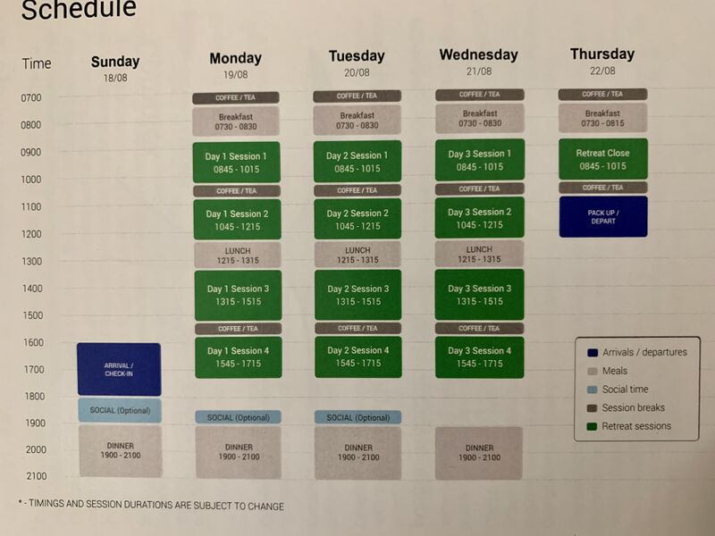 This schedule outlines the 2019 Cynefin Retreat Schedule that was held in Whistler, BC, Canada. It provides a broad timing outline for running a Triopticon over 3-4 days