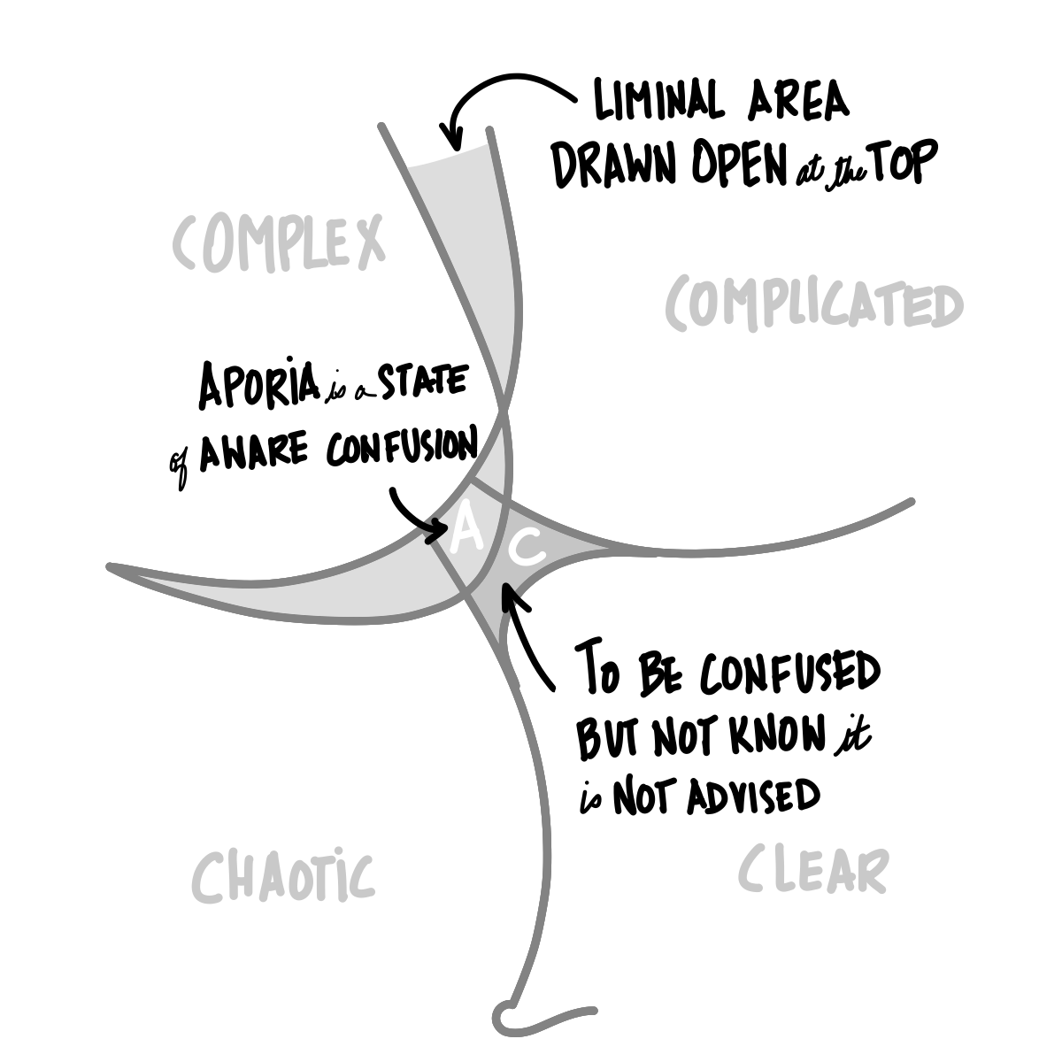 From the cynefin21 book illustrated by Sue Borchardt. Cynefin framework with liminal curve features labeled.