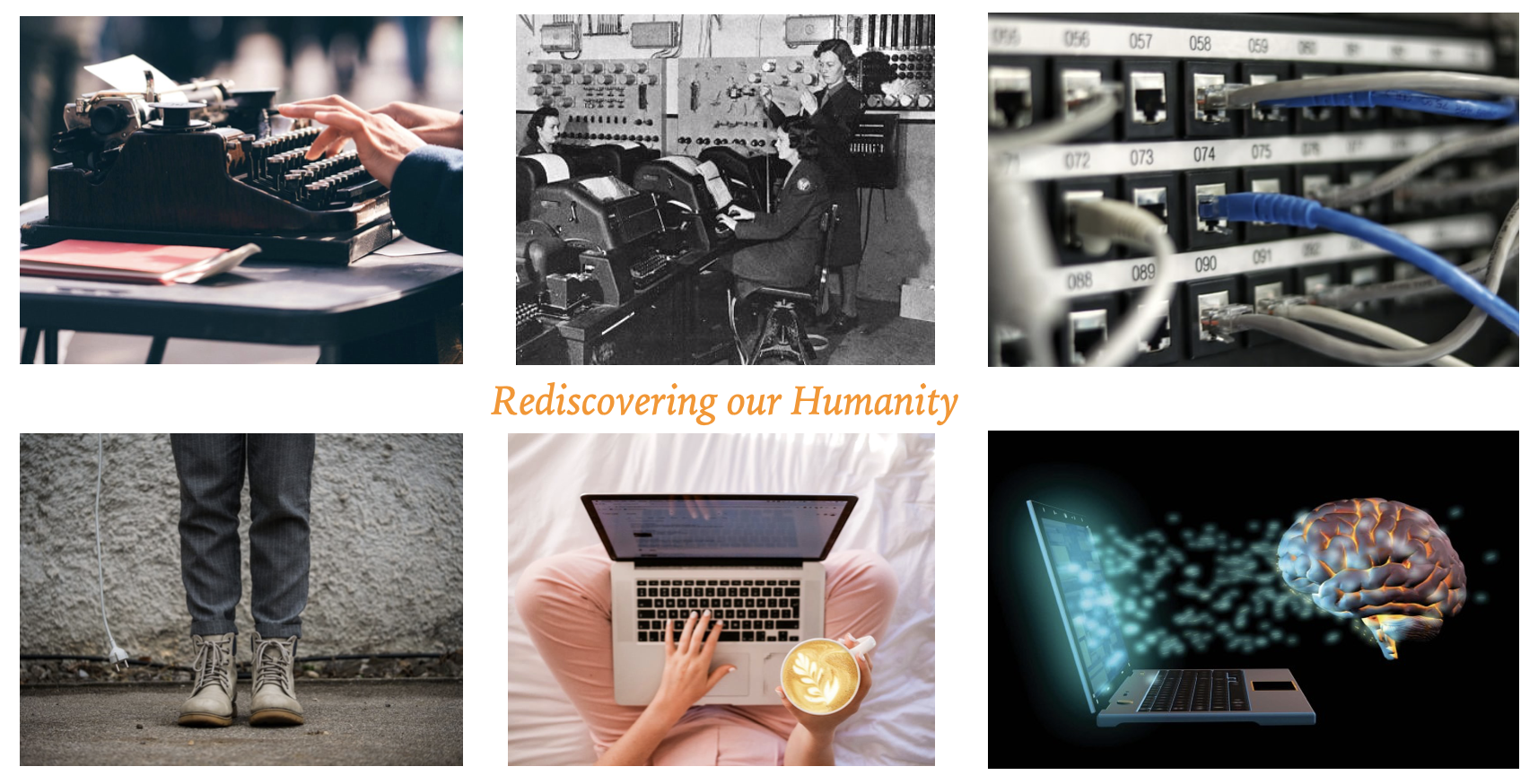 A visual description of SJM's technical journey. Manual typewriter, signals in the Australian Army, Telecommunications, walk & plug, working from home, evolving AI and rediscovering our Humanity.
