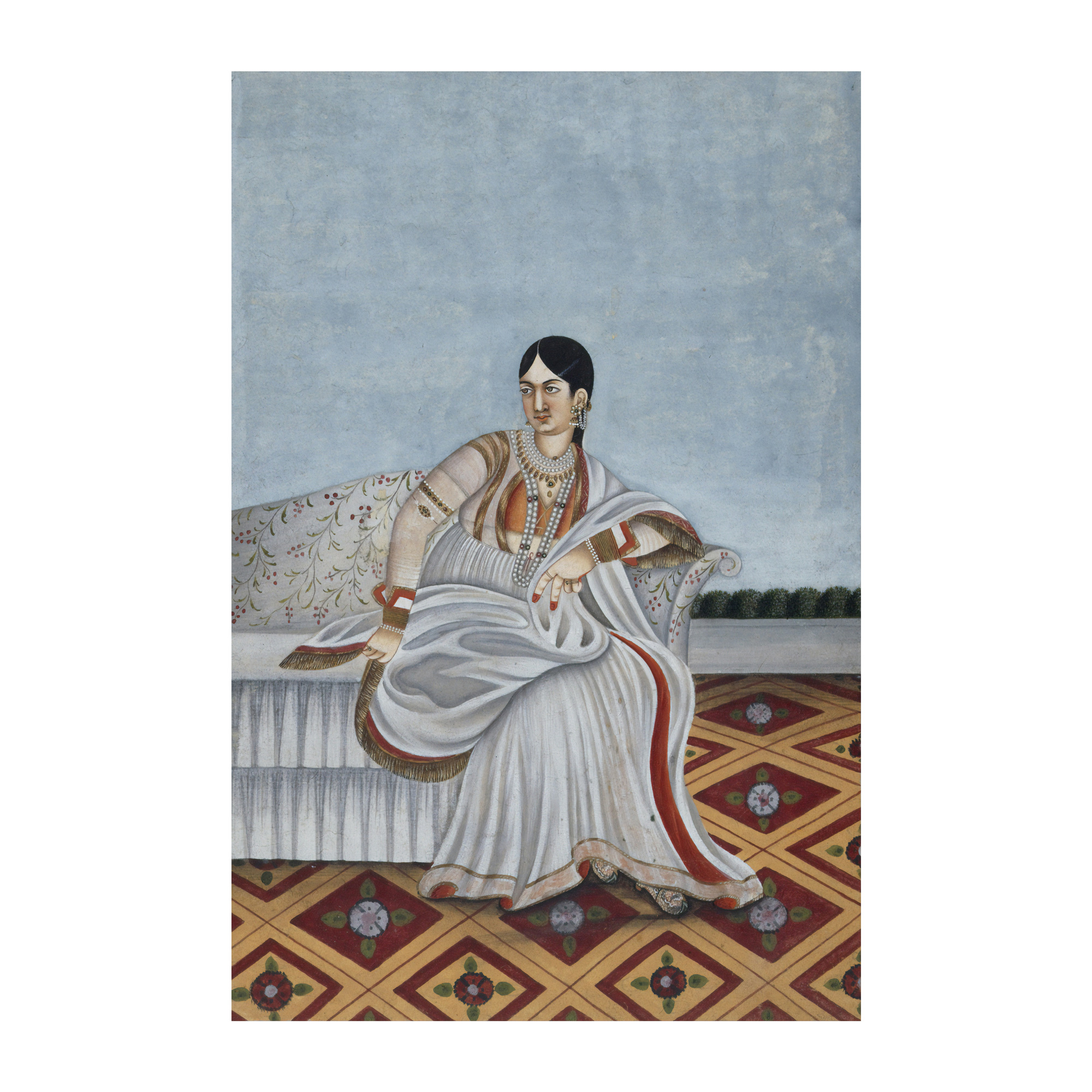 A portrait of a dancing girl in a white sari with a red border, seated on a western style sofa on a terrace. Circa 1780 - Picture by British Library on Unsplash