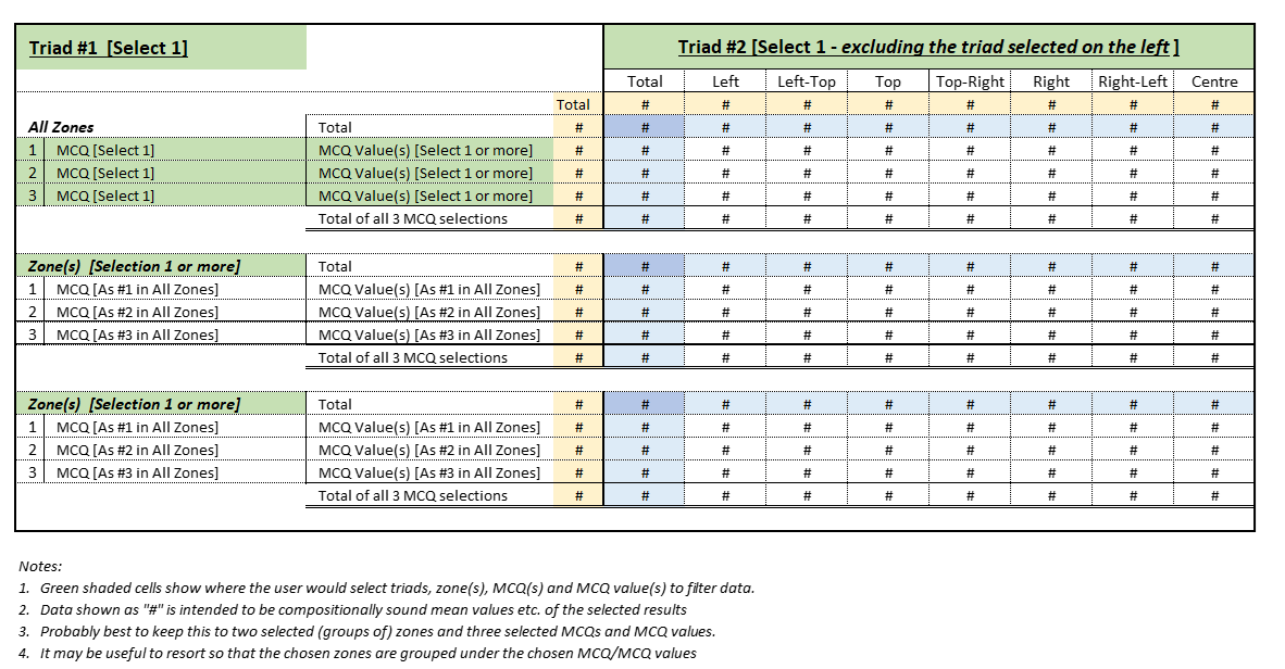 Illustrative data table for comparison of compositionally sound means for different/filtered cohorts of data in Triad 1