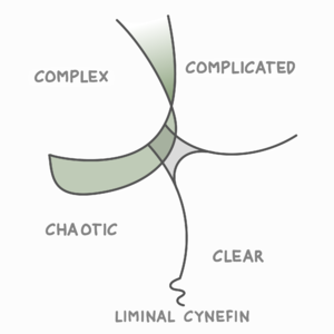 It was introduced to Cynefin in 2017 and allows the suspending or holding a position related to the complex/compliance and complex/chaos transitions and avoids the necessity of introducing another domain, in effect, it adds two shadow domains while allowing the tapping of a wide body of literature.